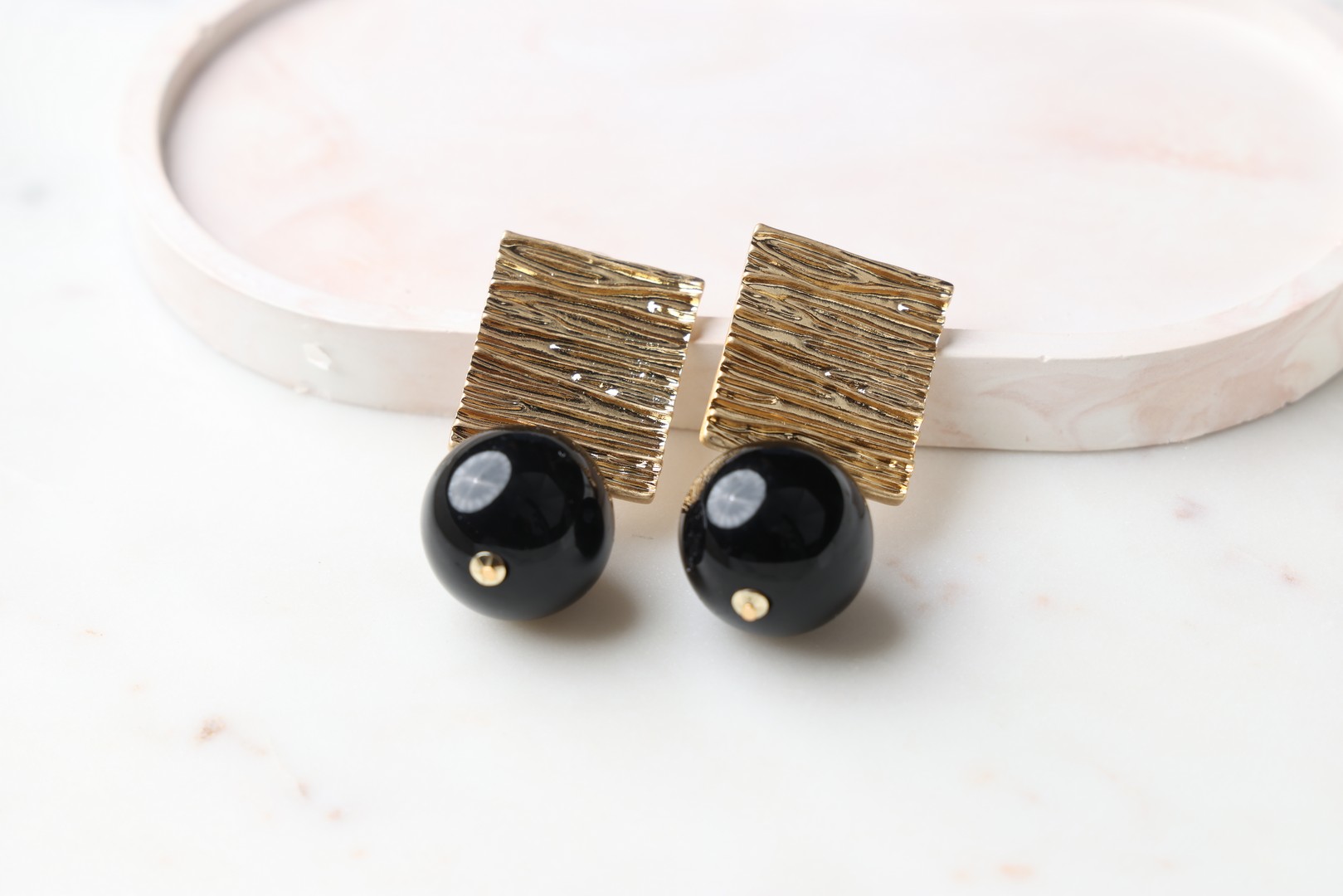 Σετ σκουλαρίκια καρφωτά ορθογώνιο σφυρήλατο σχήμα , από επιχρυσωμένο ζαμάκ και κρεμαστή χάνδρα σε καφέ χρώμα .