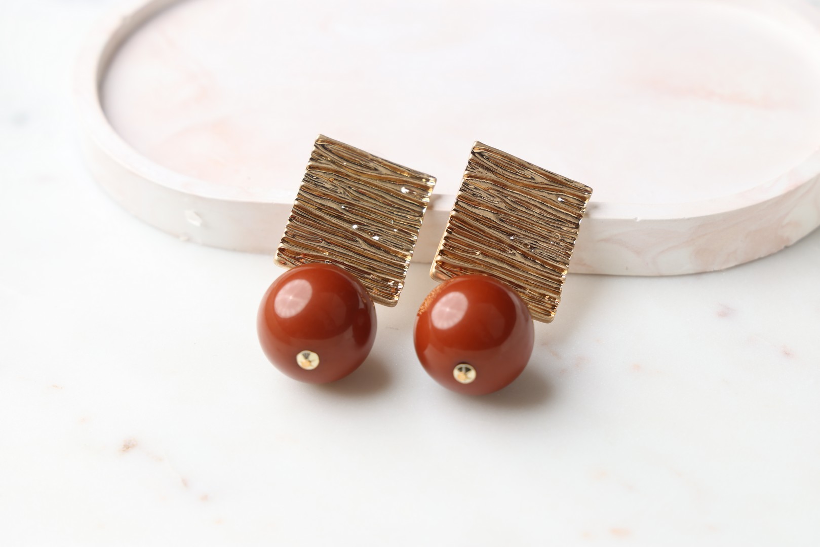 Σετ σκουλαρίκια καρφωτά ορθογώνιο σφυρήλατο σχήμα , από επιχρυσωμένο ζαμάκ και κρεμαστή χάνδρα σε μπορντώ χρώμα .