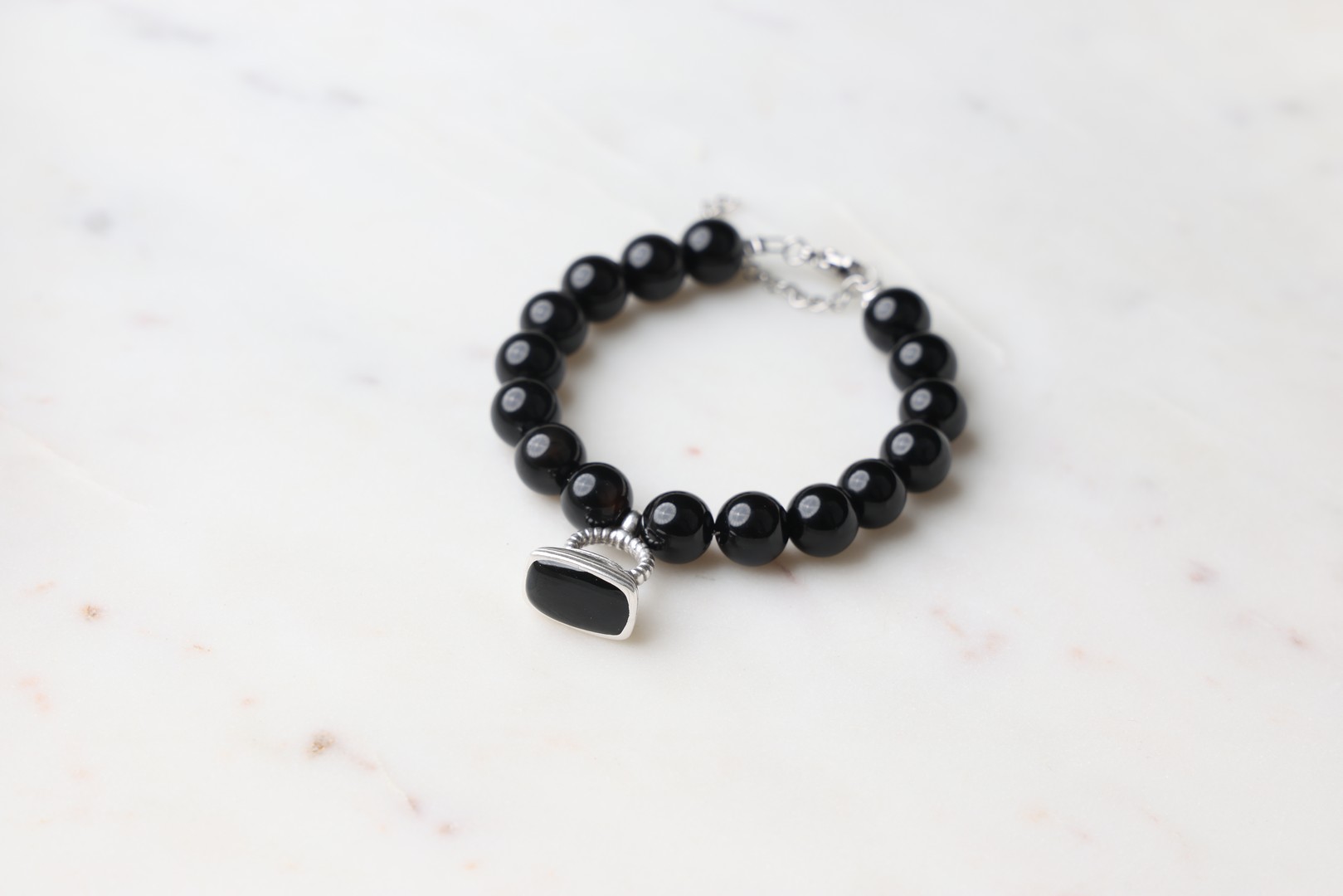 Βραχιόλι με χάνδρες αχάτη μαυρό 10mm και κρεμαστό στοιχείο με μαυρό σμάλτο από επιχρυσωμένο 24Κ κασσίτερο.