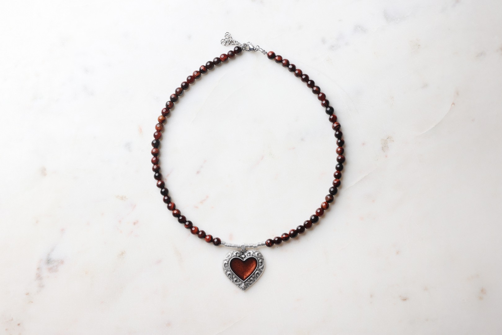 Κολιέ από χάνδρες μάτι τίγρη 6mm, κρεμαστή καρδιά με καφέ σμάλτο από επιχρυσωμένο 24Κ ζάμακ.