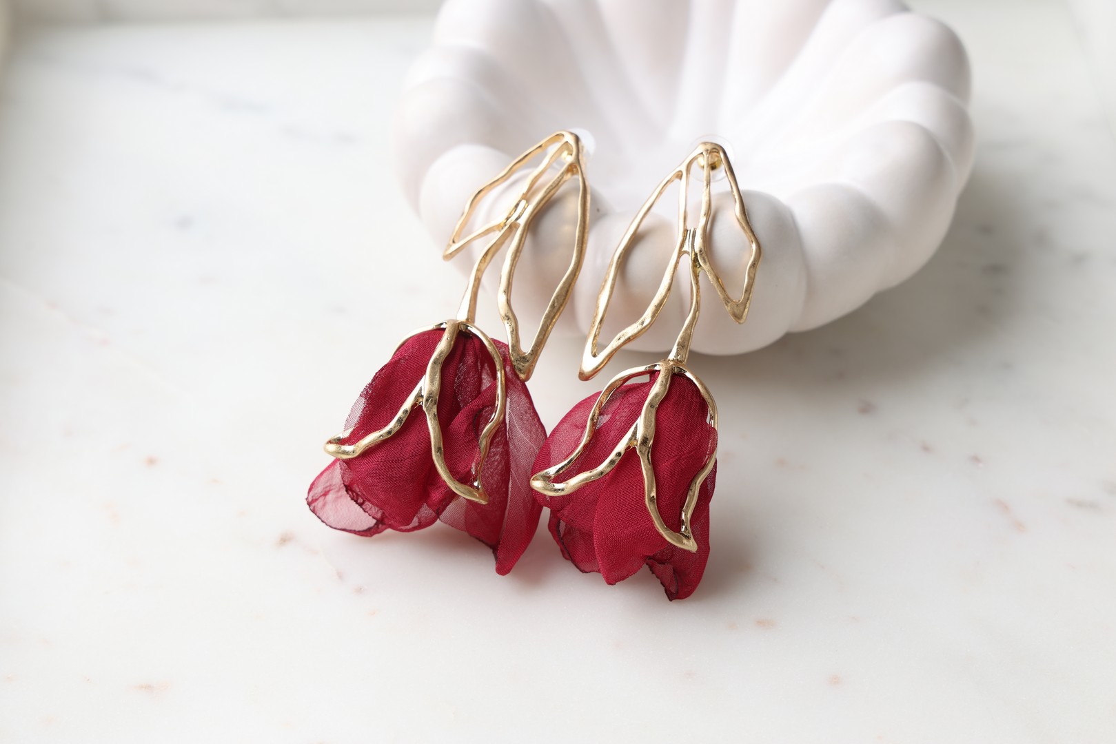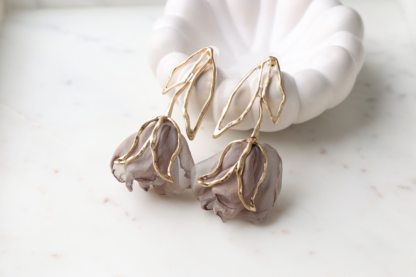 Σετ σκουλαρίκια καρφωτά , κρεμαστά , σε σχήμα τριαντάφυλλο από επιχρυσωμένο ζαμάκ και ύφασμα σε μπλε χρώμα.
